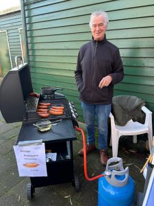 Dan wordt het tijd voor een broodje braadworst met zuurkool, van de barbecue.