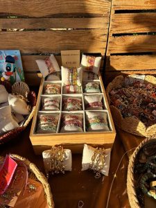 Brei en haakwerkjes, houtbewerking in alle maten en soorten, sieraden en engeltjes, bekers van klei met een hyacint erin, kun je later als drinkbeker gebruiken, chocolade, natuurlijk ook de bloembollen en nog veel meer