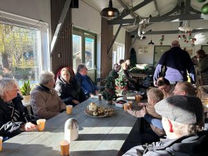 Dan maar een pauze houden in de kantine met een kopje koffie en een heerlijke appeltaart met slagroom. Ik  loop en fiets de calorieën er wel weer af. In de kantine was het ook weer bomvol, zowel voor de versnaperingen, als de activiteiten bij de kerststukjes. Wat een gezellige, warme bedrijvigheid.