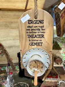 Voor in de tuin waren er genoeg attributen van hout, takken of riet, met vet en voer voor de vogels. Ook met mooie spreuken en antieke kopjes.