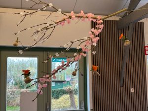 —De versiering met de bloemen op tafel en “in de lucht” en de eieren, zijn verzorgd door Carolien.