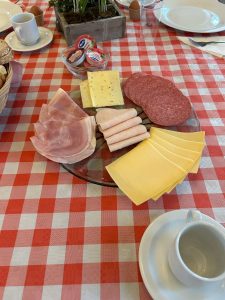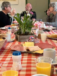Schalen met broodjes, croissantjes, suikerbrood, bruinbrood,  krentenbrood en heerlijk beleg. En als drank; melk, jus d’orange, koffie en thee.