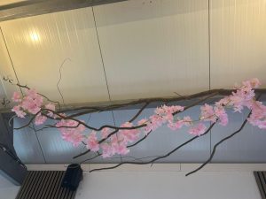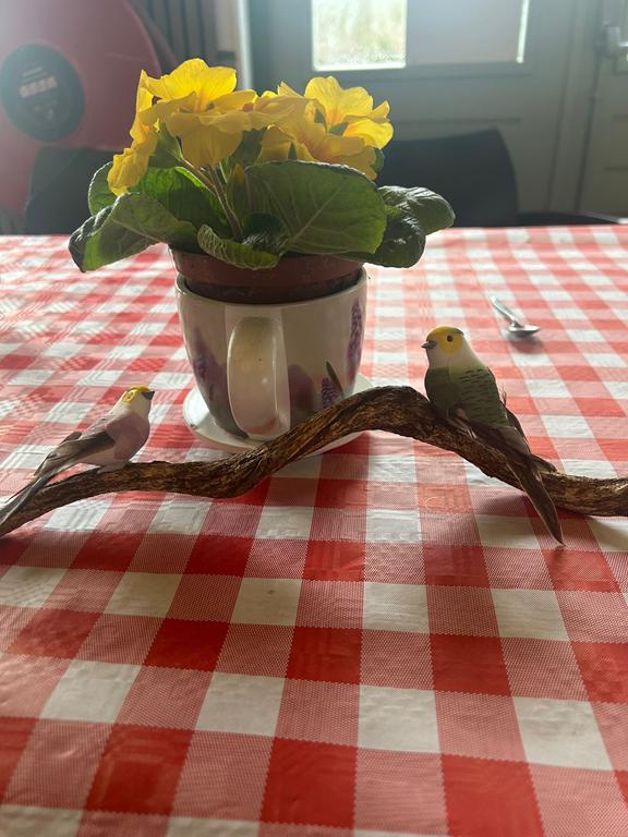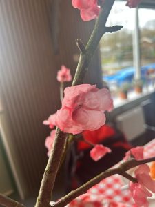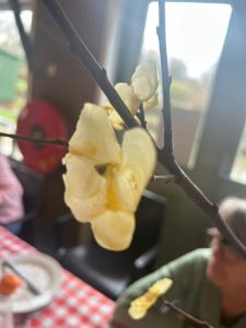De tafels zijn met prachtige voorjaarsbloemen versierd. Carolien heeft de bloesem gemaakt van kaarsvet. Ze vertelde dat het kaarsvet gesmolten wordt en dan in een soort druppel, voorzichtig, op de takken wordt gezet. Wat een immens werk.
