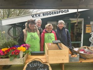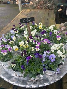 Mary stond met drie vrijwilligers, waarvan er 2 nieuw zijn, klaar voor de start van het nieuwe seizoen, met kleurrijke viooltje, voorjaarsbloemen en groente.