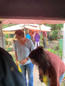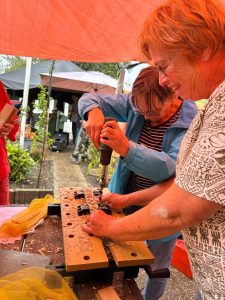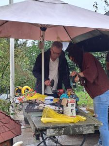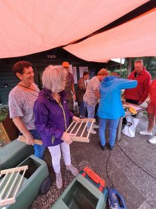 Leo had er voor gezorgd dat er droog gewerkt kon worden, want het was een regenachtige dag. Onder een grote tuinparasol en dekzeil werd er druk gezaagd, geboord en veel gelachen. Het resultaat was dat eenieder, volgens een bouwtekening van Eduard, een mooi wormenhotel als eindproduct kreeg.